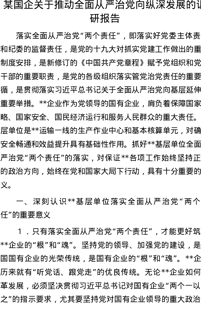 20221004某国企关于推动全面从严治党向纵深发展的调研报告