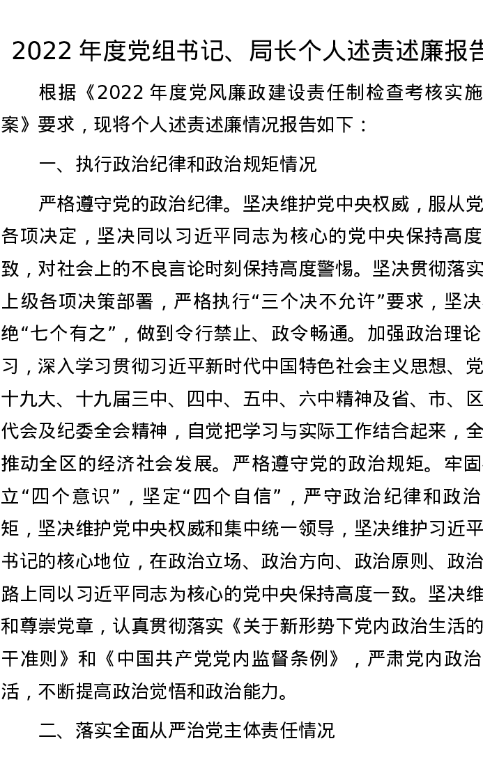 2022年度党组书记、局长个人述责述廉报告