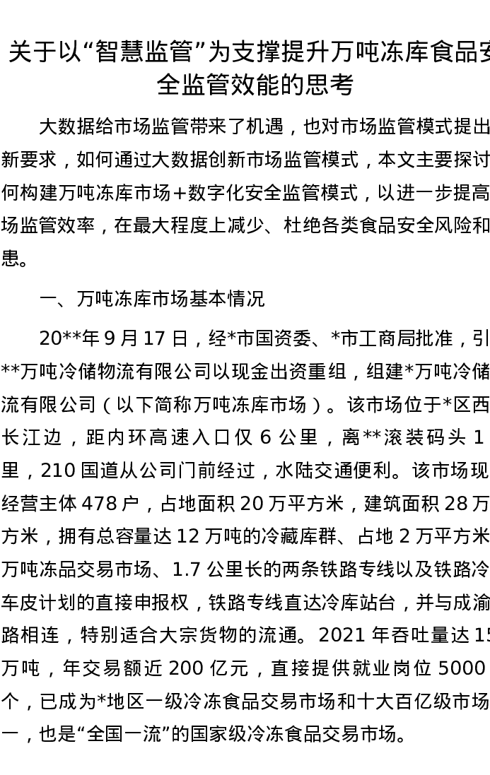 关于以“智慧监管”为支撑提升万吨冻库食品安全监管效能的思考