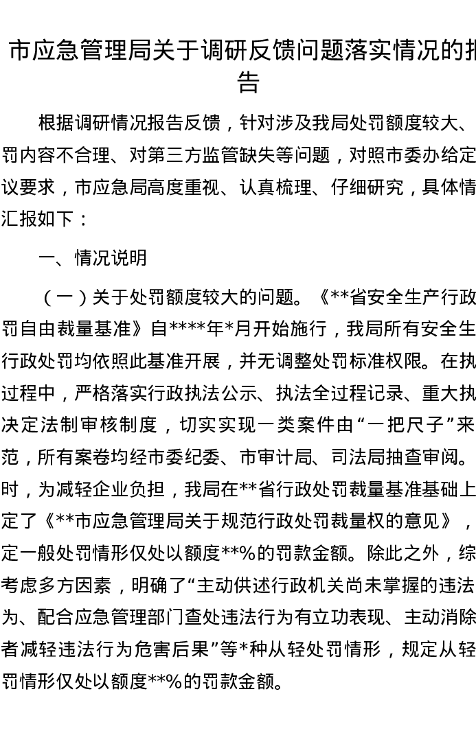 市应急管理局关于调研反馈问题落实情况的报告