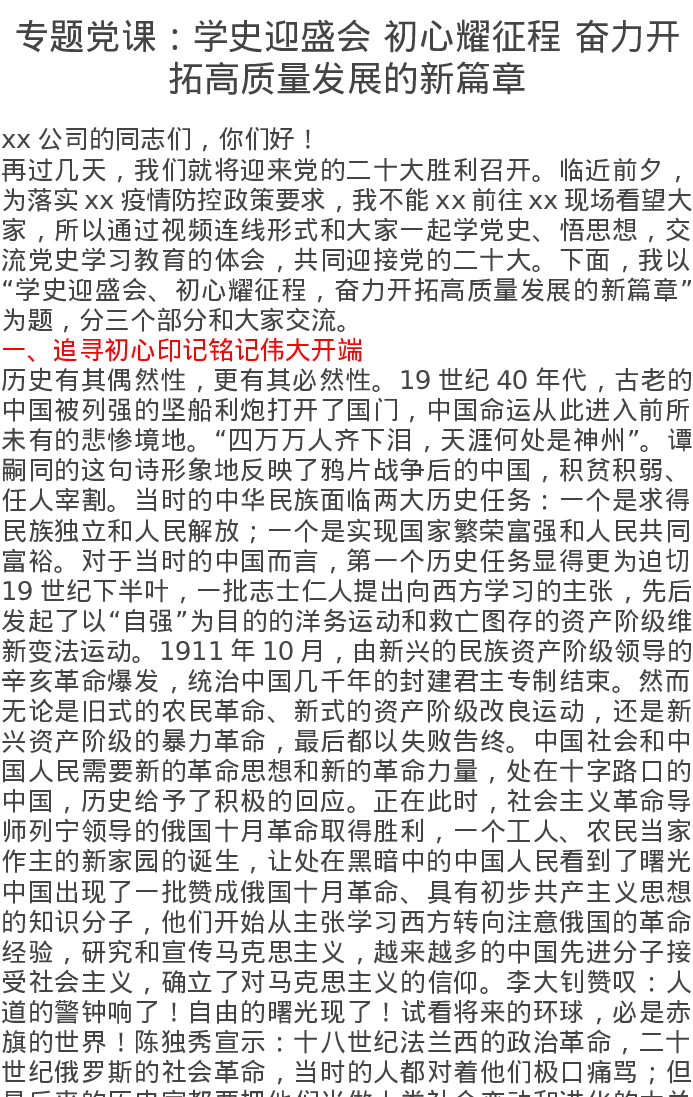 党课讲稿:学史迎盛会 初心耀征程 奋力开拓高质量发展的新篇章