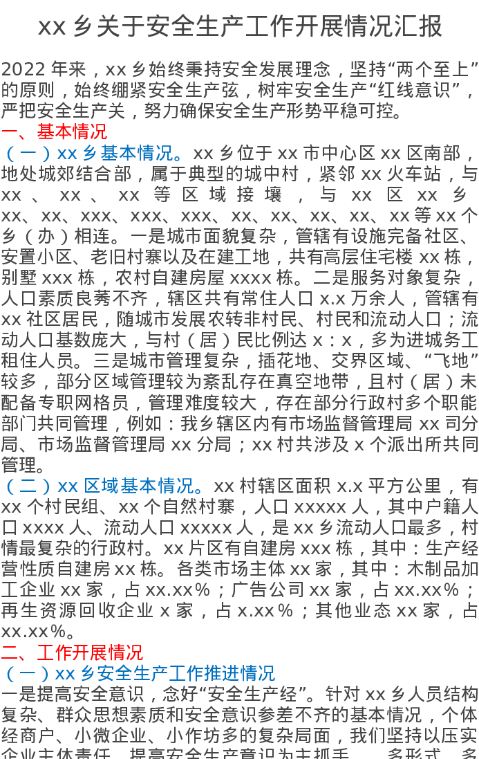 xx乡关于安全生产工作开展情况汇报