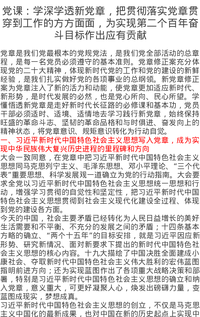 党课讲稿:学深学透新党章,把贯彻落实党章贯穿到工作的方方面面,为实现第二个百年奋斗目标作出应有贡献