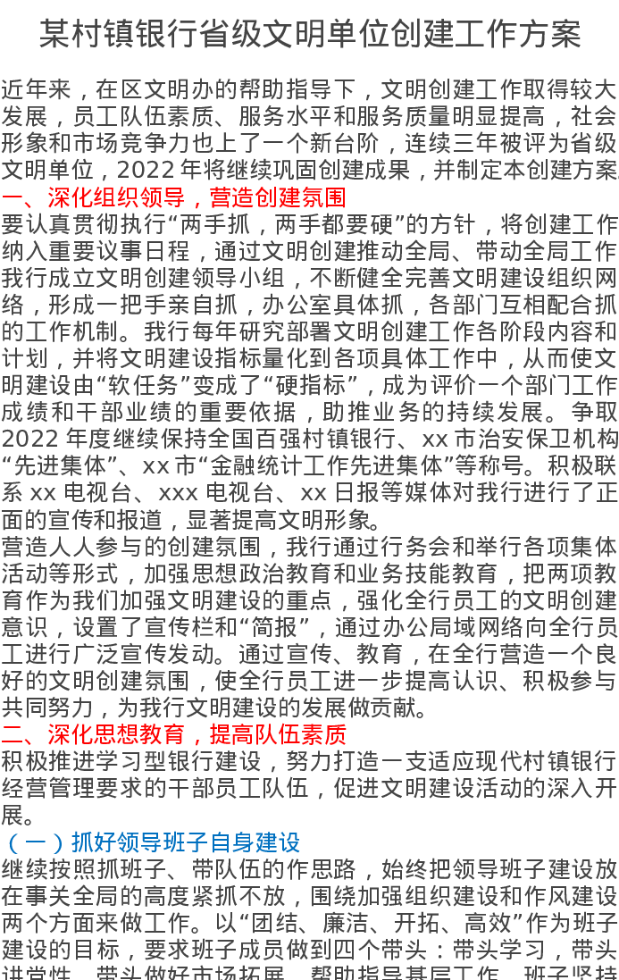 某村镇银行省级文明单位创建工作方案