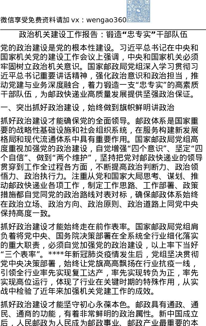 政治机关建设工作报告:锻造“忠专实”干部队伍