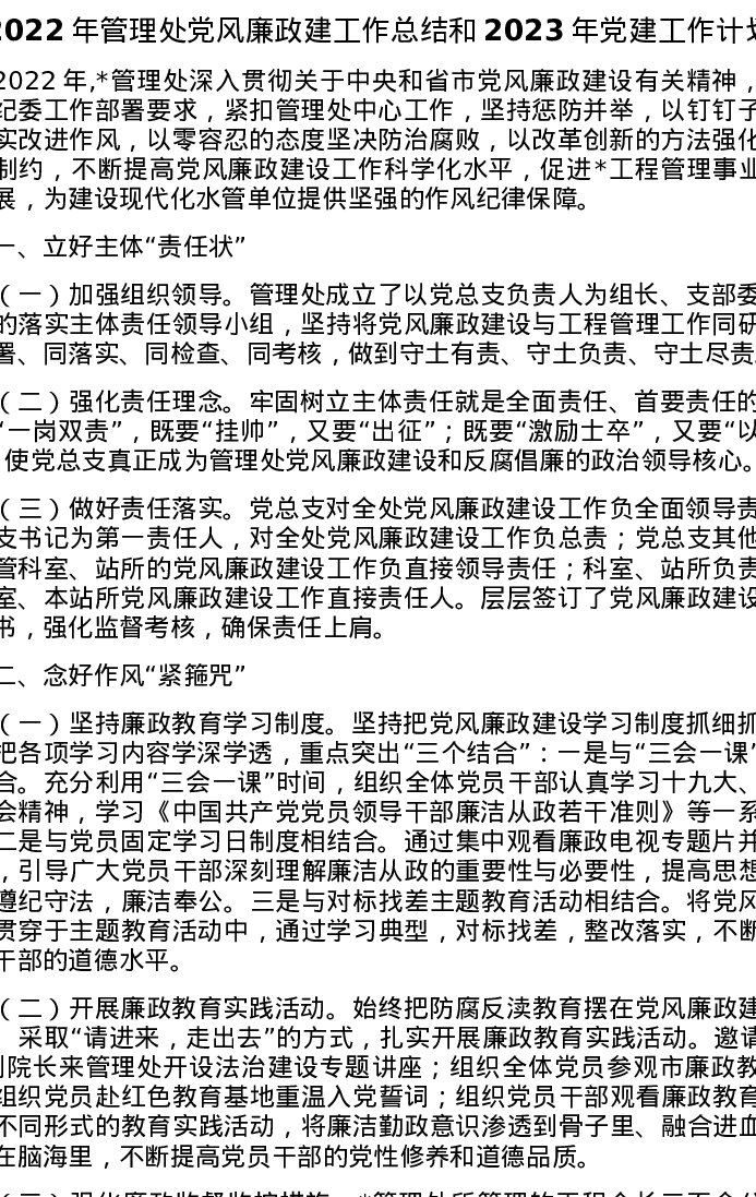 2022年管理处党风廉政建工作总结和2023年党建工作计划
