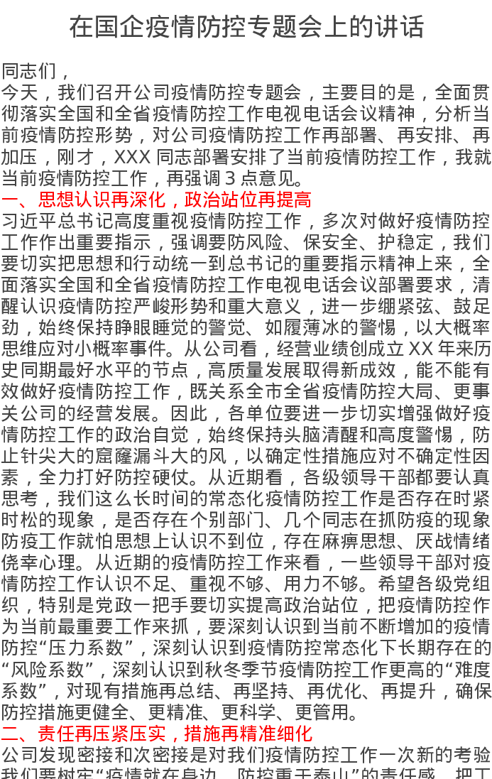 在国企疫情防控专题会上的讲话