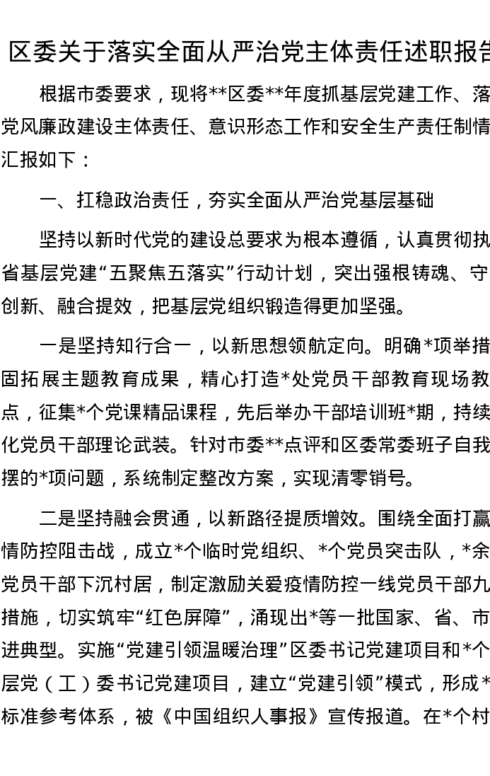 20221107区委关于落实全面从严治党主体责任述职报告