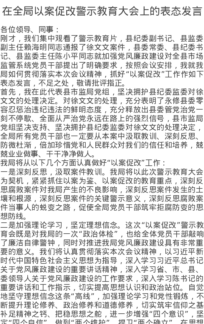 在全局以案促改警示教育大会上的表态发言