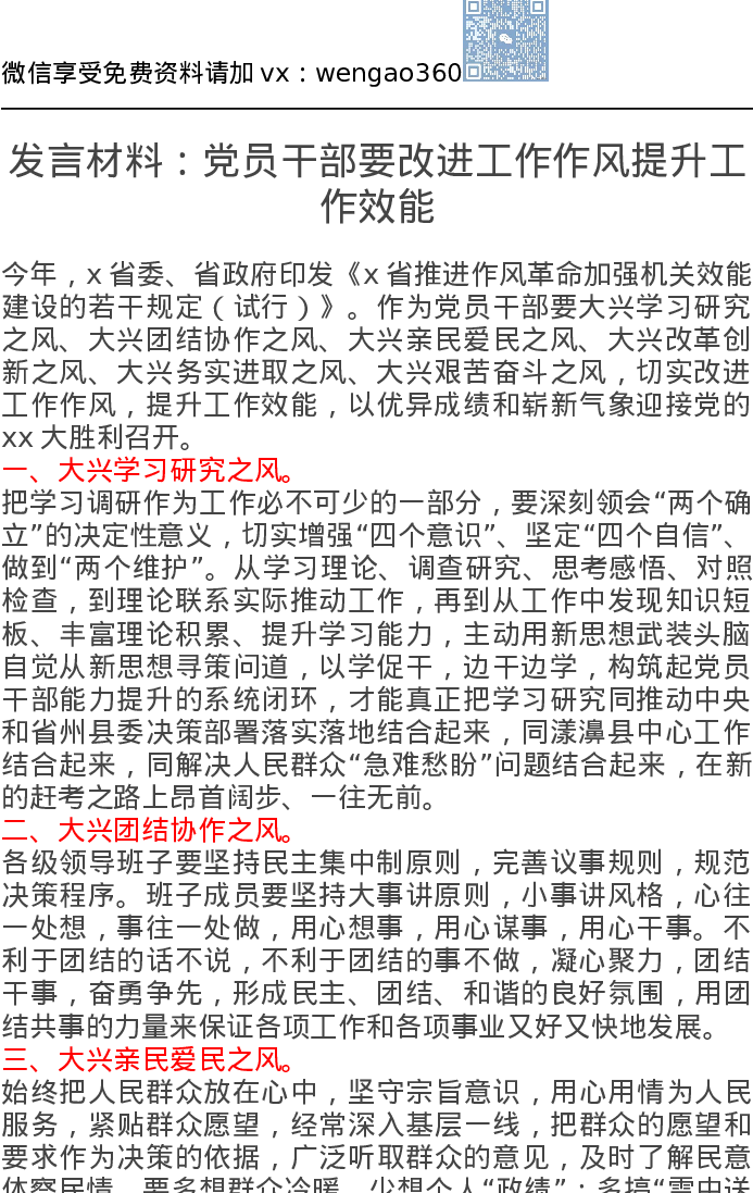 发言材料:党员干部要改进工作作风提升工作效能