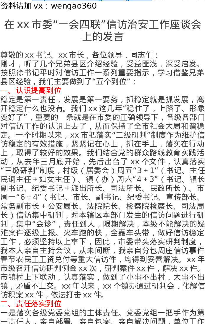 在xx市委“一会四联”信访治安工作座谈会上的发言