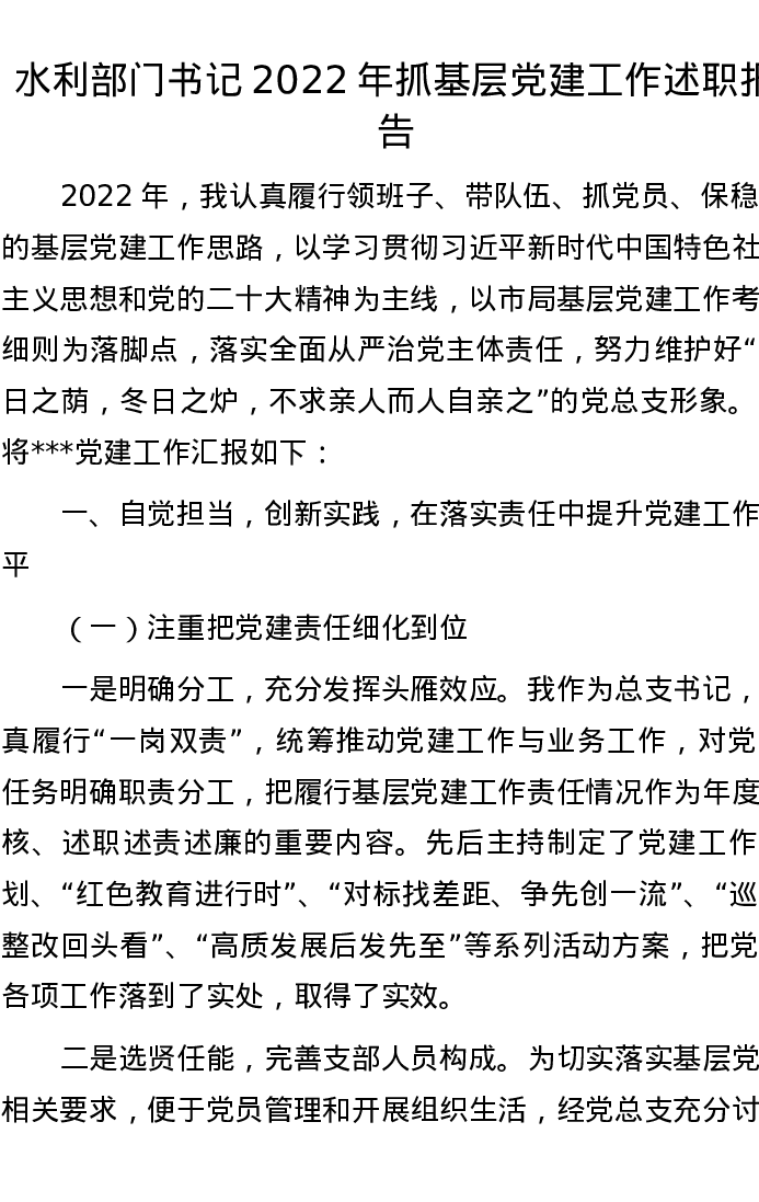 20221115水利部门书记2022年抓基层党建工作述职报告