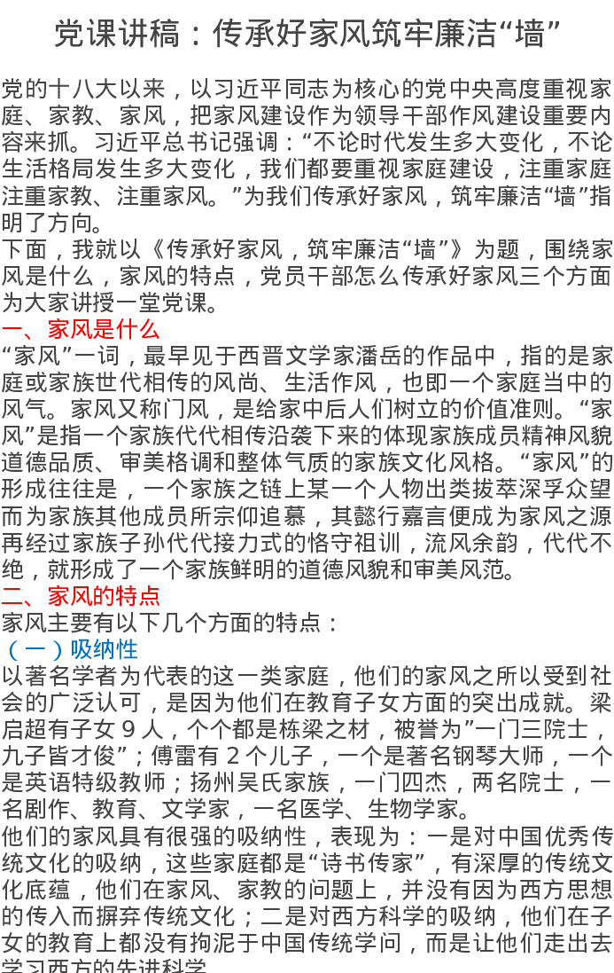 党课讲稿:传承好家风筑牢廉洁“墙”