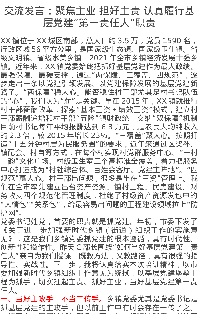 交流发言:聚焦主业 担好主责 认真履行基层党建“第一责任人”职责