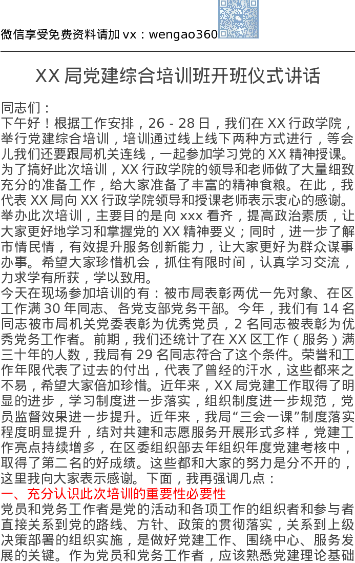 XX局党建综合培训班开班仪式讲话