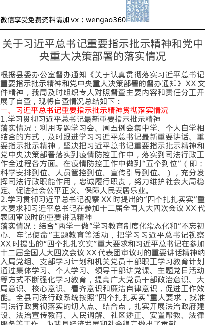 关于习近平总书记重要指示批示精神和党中央重大决策部署的落实情况