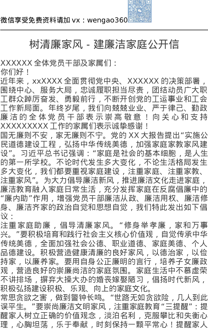 树清廉家风-建廉洁家庭公开信
