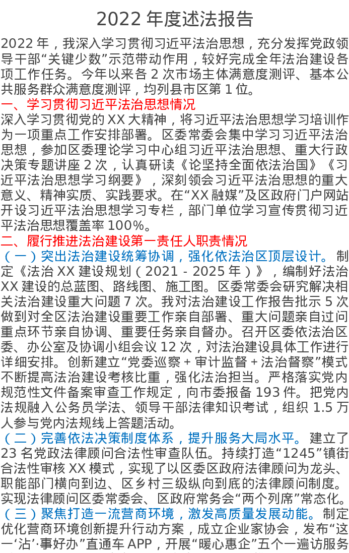 党政主要负责人2022年度述法报告汇编6篇
