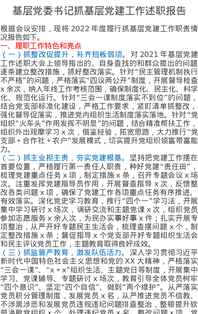 基层党委书记抓基层党建工作述职报告