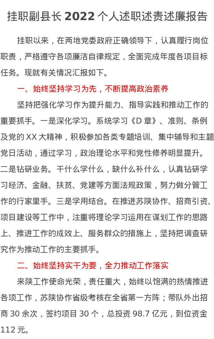 挂职副县长2022个人述职述责述廉报告