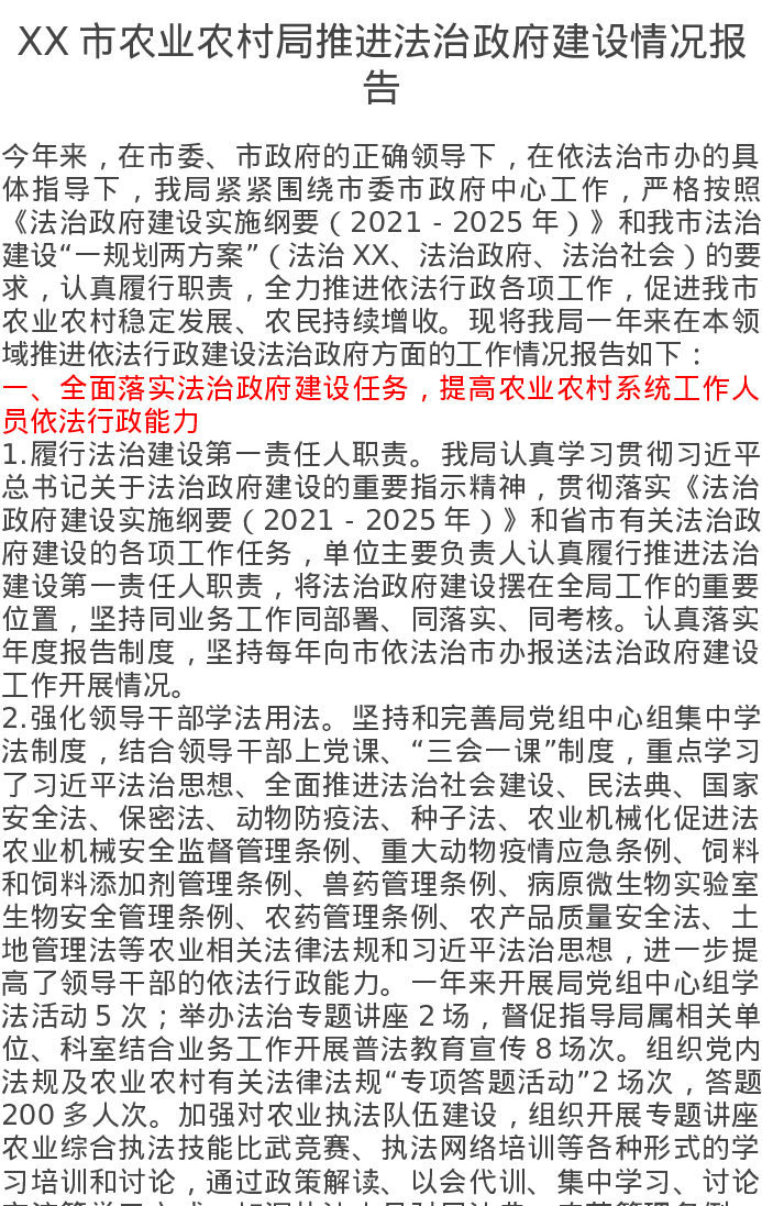XX市农业农村局推进法治政府建设情况报告