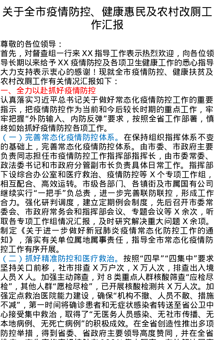 关于全市疫情防控、健康惠民及农村改厕工作汇报