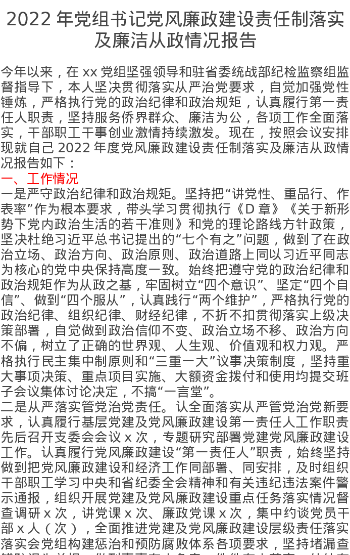 2022年党组书记党风廉政建设责任制落实及廉洁从政情况报告