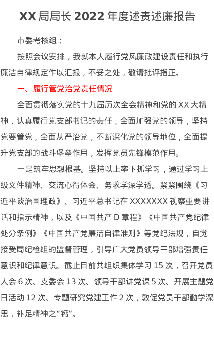 XX局局长2022年度述责述廉报告