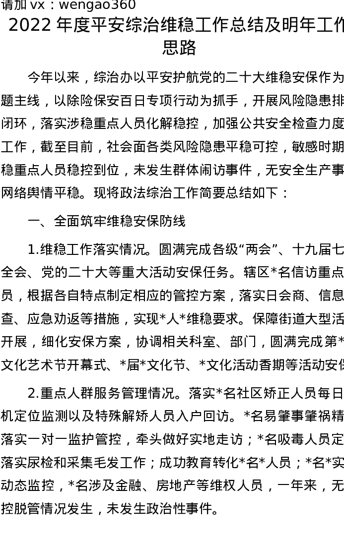 2022年度平安综治维稳工作总结及明年工作思路