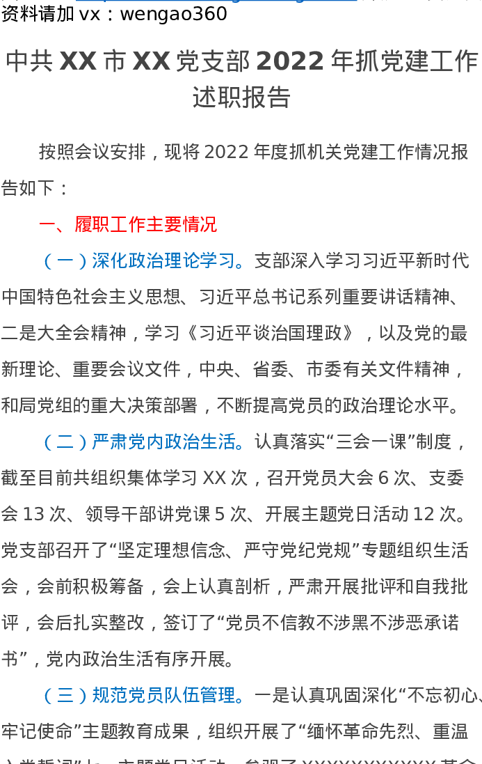 中共XX市XX党支部2022年抓党建工作述职报告