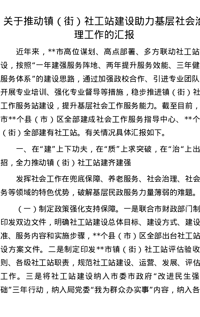 关于推动镇(街)社工站建设助力基层社会治理工作的汇报