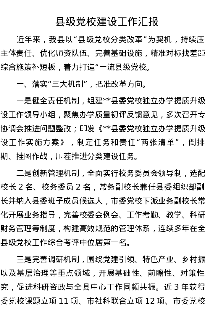 县级党校建设工作汇报