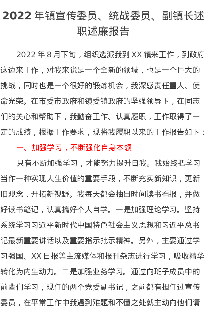 2022年镇宣传委员、统战委员、副镇长述职述廉报告