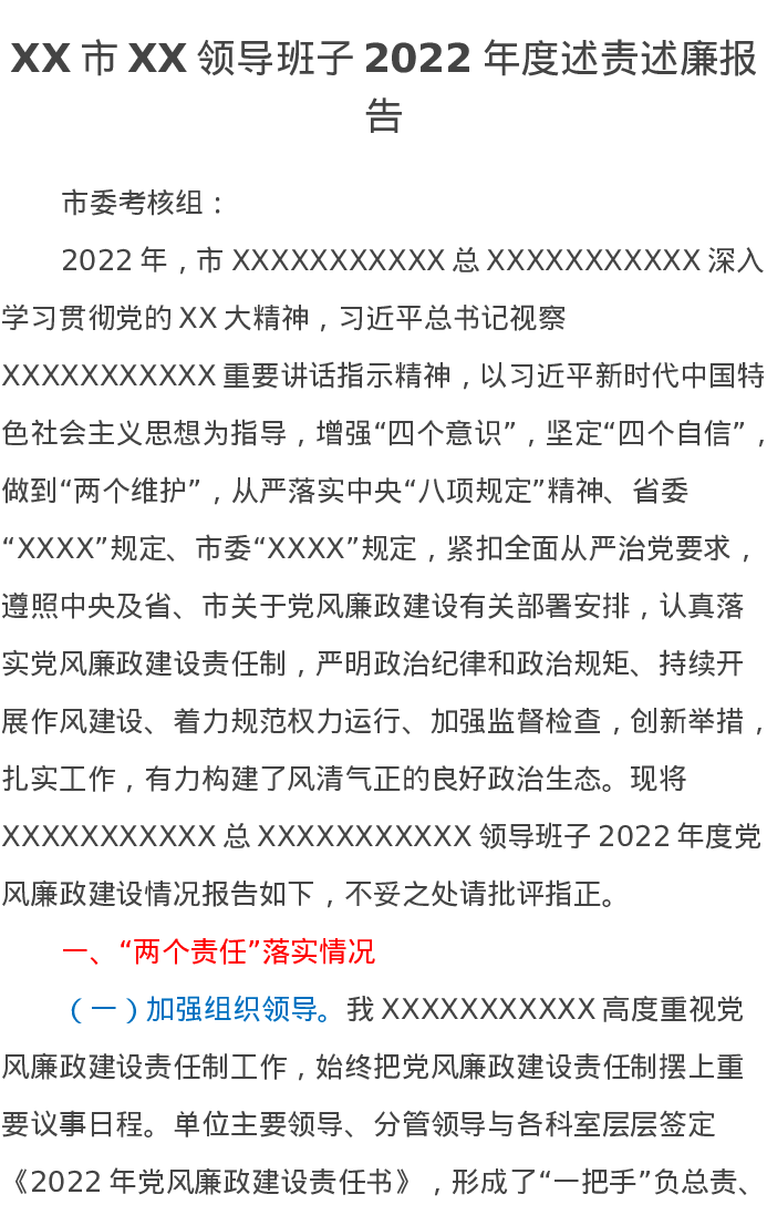 XX市XX领导班子2022年度述责述廉报告