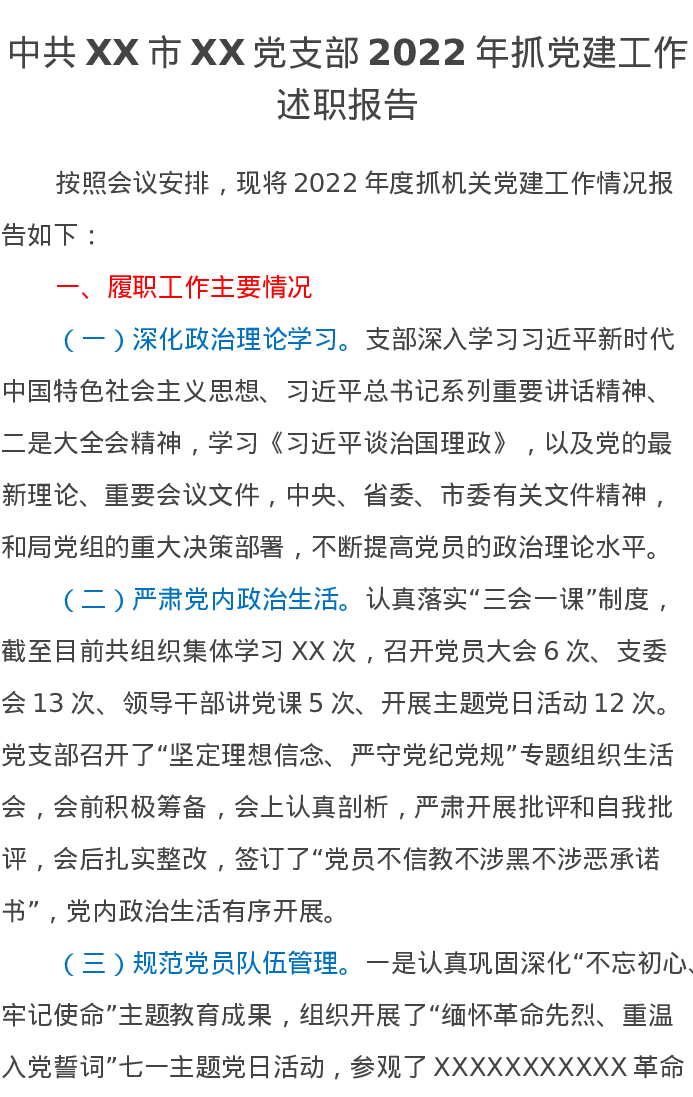 中共XX市XX党支部2022年抓党建工作述职报告