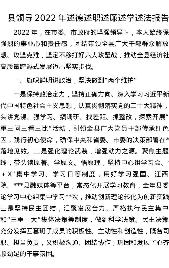 县领导2022年述德述职述廉述学述法报告