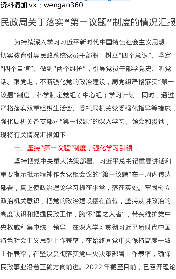 民政局关于落实“第一议题”制度的情况汇报