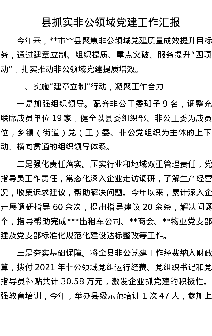 县抓实非公领域党建工作汇报