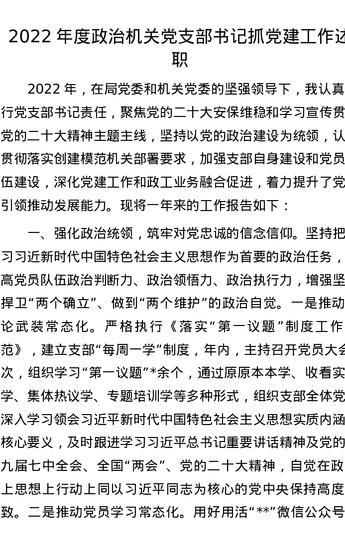 2022年度政治机关党支部书记抓党建工作述职
