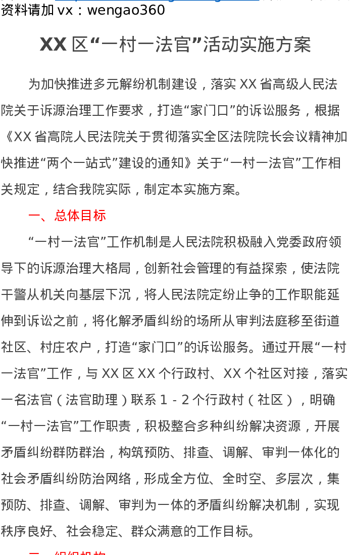 XX区“一村一法官”活动实施方案