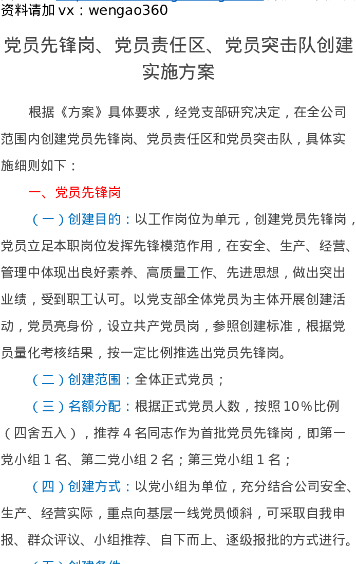 党员先锋岗、党员责任区、党员突击队创建实施方案
