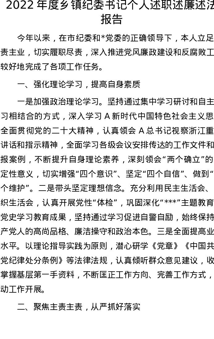 2022年度乡镇纪委书记个人述职述廉述法报告