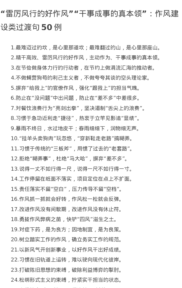 “雷厉风行的好作风”“干事成事的真本领”:作风建设类过渡句50例