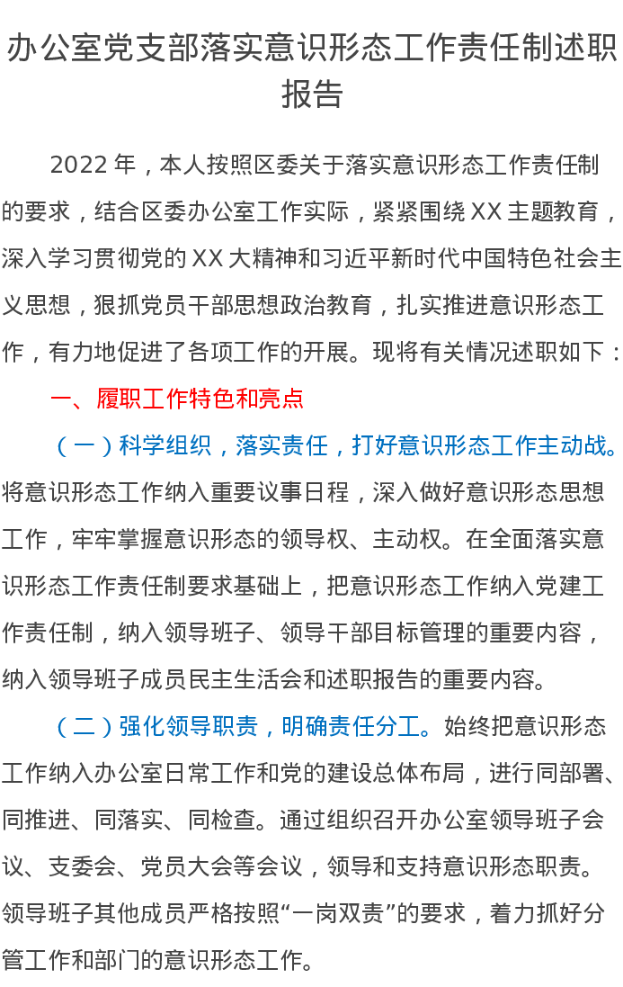 办公室党支部落实意识形态工作责任制述职报告