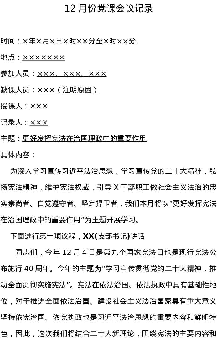 会议记录:2022年12月份主题党日党课学习会议记录-更好发挥宪法在治国理政中的重要作用