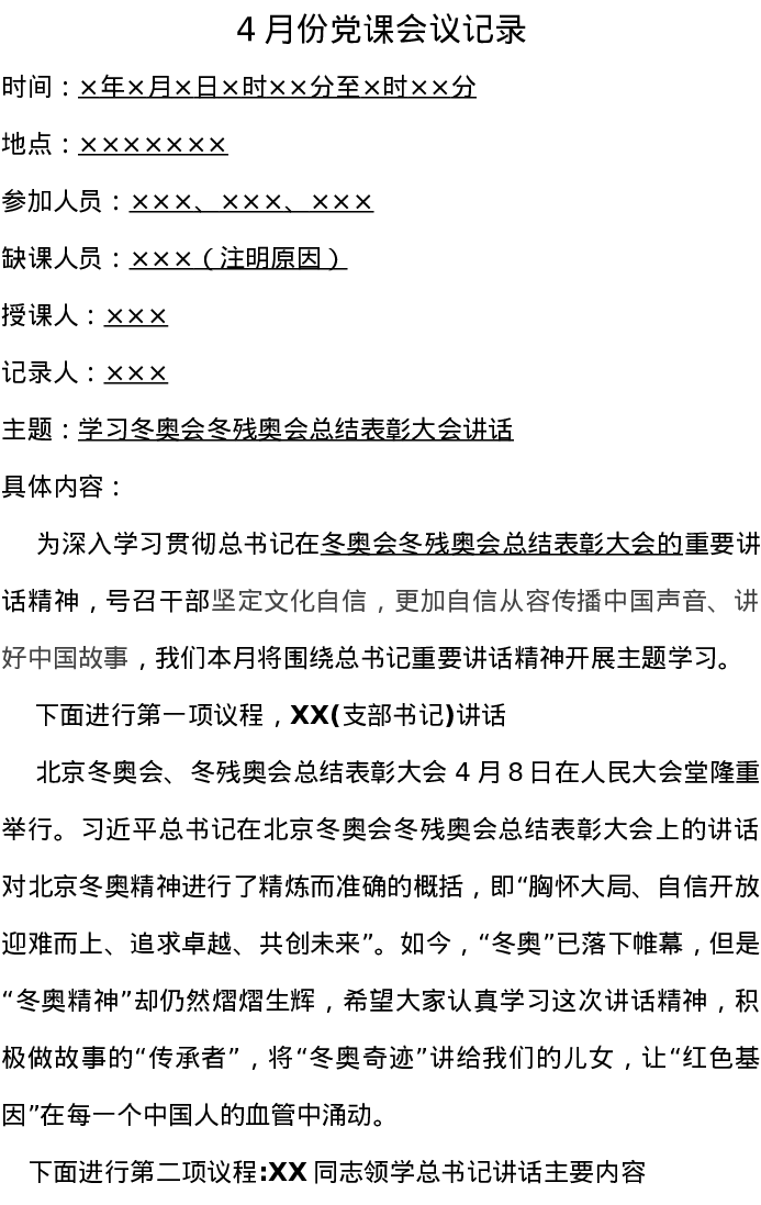 会议记录:2022年4月份主题党日党课学习会议记录-学习冬奥会表彰讲话