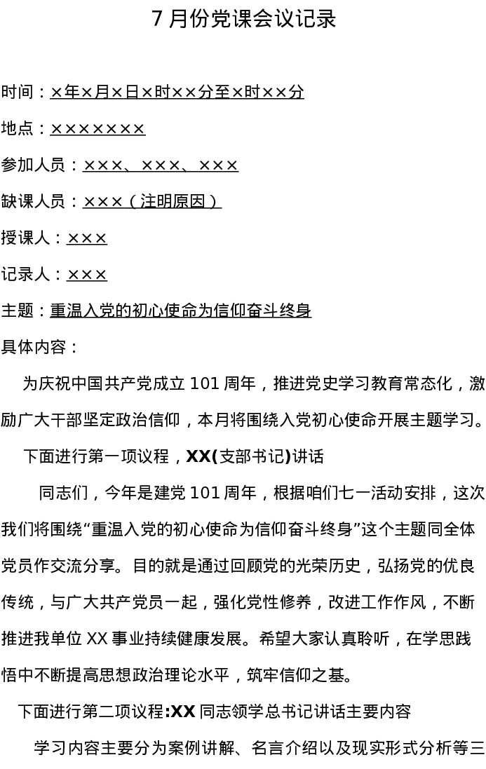 会议记录:2022年7月份主题党日党课学习会议记录-重温入党的初心使命为信仰奋斗终身