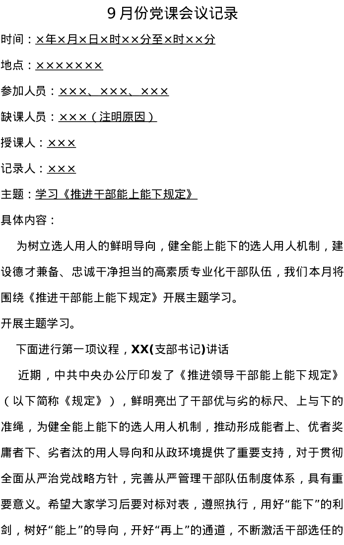 会议记录:2022年9月份主题党日党课学习会议记录-学习《推进干部能上能下规定》