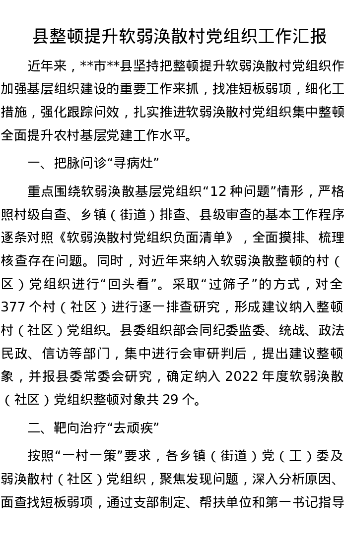 县整顿提升软弱涣散村党组织工作汇报