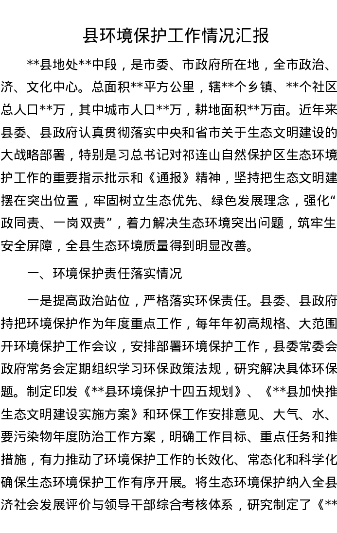 县环境保护工作情况汇报